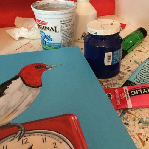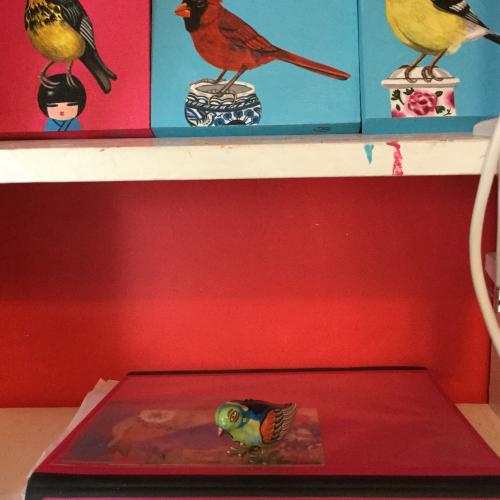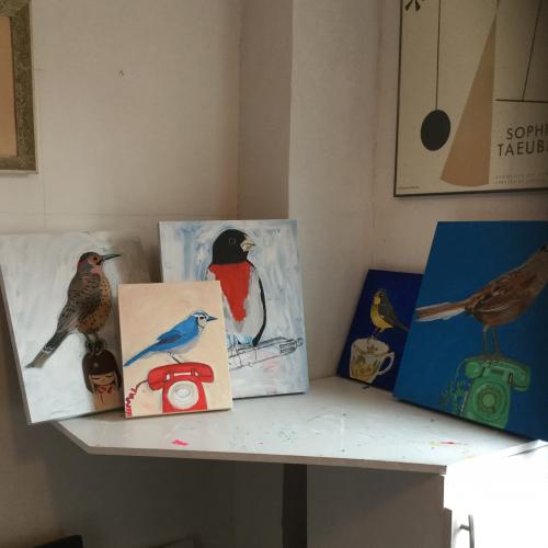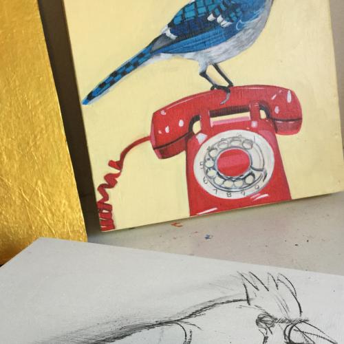 I have been painting birds for 3 years ( having worked as an illustrator for most of my career) Birds inspire me immensely because of their wild beauty and keen intelligence. City people especially treasure these wonderful creatures as they are a vivid connection to nature which is often hard to find in the concrete jungle. Not wanting to be a traditional wildlife painter I enjoy perching the birds on familiar and iconic objects. I am happy to forfeit a realistic relationship between bird and object but the overall design has to be harmonious and the bird is always the focal point. I enjoy working out the colour of the background. The main objective is for the bird to pop.